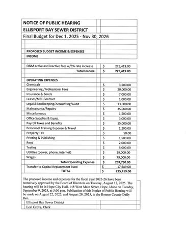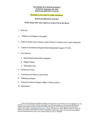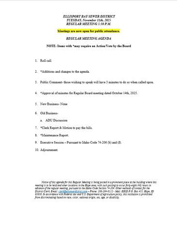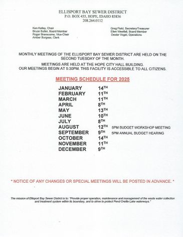 Ellisport Bay Sewer District will be holding their Regular Meetings on the second Tuesday of every month at 5:30 pm . The location of the meeting is at the Hope City Hall.